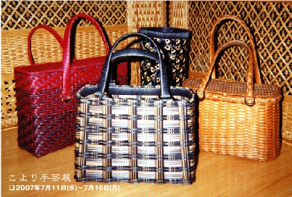 荷造り用の紙バンドが素材です。 染めてから松ヤニを3〜4回繰り返し塗り光沢と堅牢さを出します。 佐藤さんの作品は軽くて丈夫で、しかもお買い得です。 どうぞお出かけ下さい。生徒さんの作品も展示します。